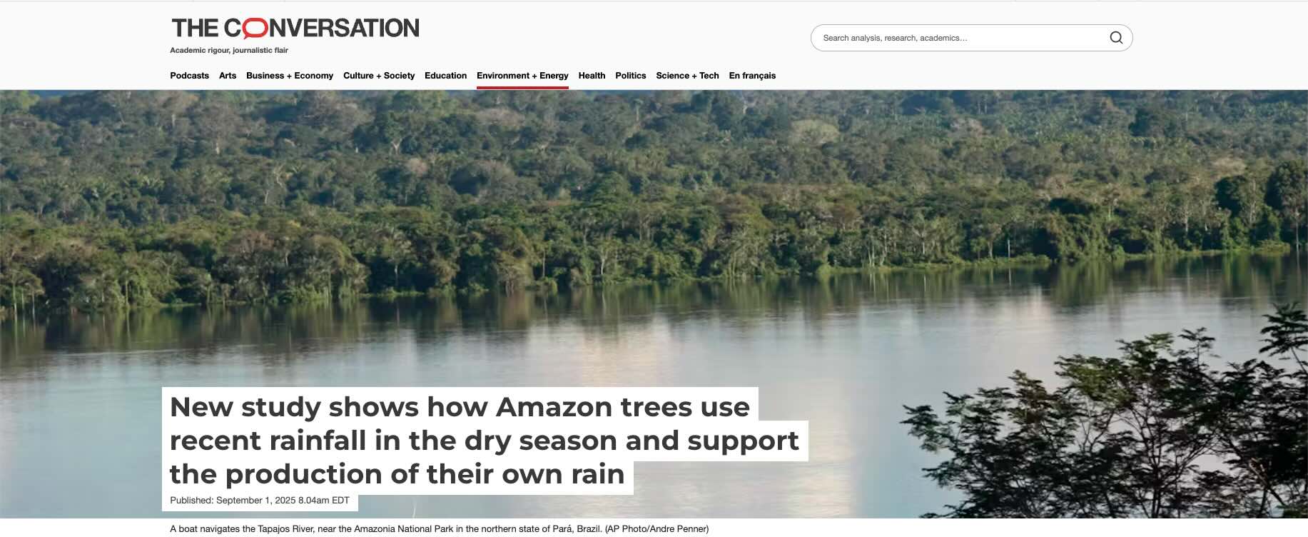 Nehemy Published in the Conversation Lab Alumni, Magali Nehemy featured Sep 23, 2025 Research Highlight Magali's work published in the Conversation. Read the article here: New Study Shows how Amazon Trees use Recent Rainfall in the Dry Season and Support the Production of Their Own Rain