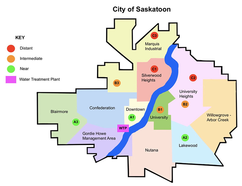 Our results showed that the majority of samples were slightly below the recommended target of 0.7 mg/L, with a citywide average of 0.66 mg/L. We also saw a spatial pattern, with average fluoride concentrations being the highest at locations closest to the treatment plant and gradually decreasing with distance. Overall, fluoride levels in Saskatoon are near the recommended level for optimal oral health, however, the variability observed emphasizes the importance of monitoring fluoride not only at the treatment plant, but also throughout the city to ensure consistent and equitable exposure for all residents.